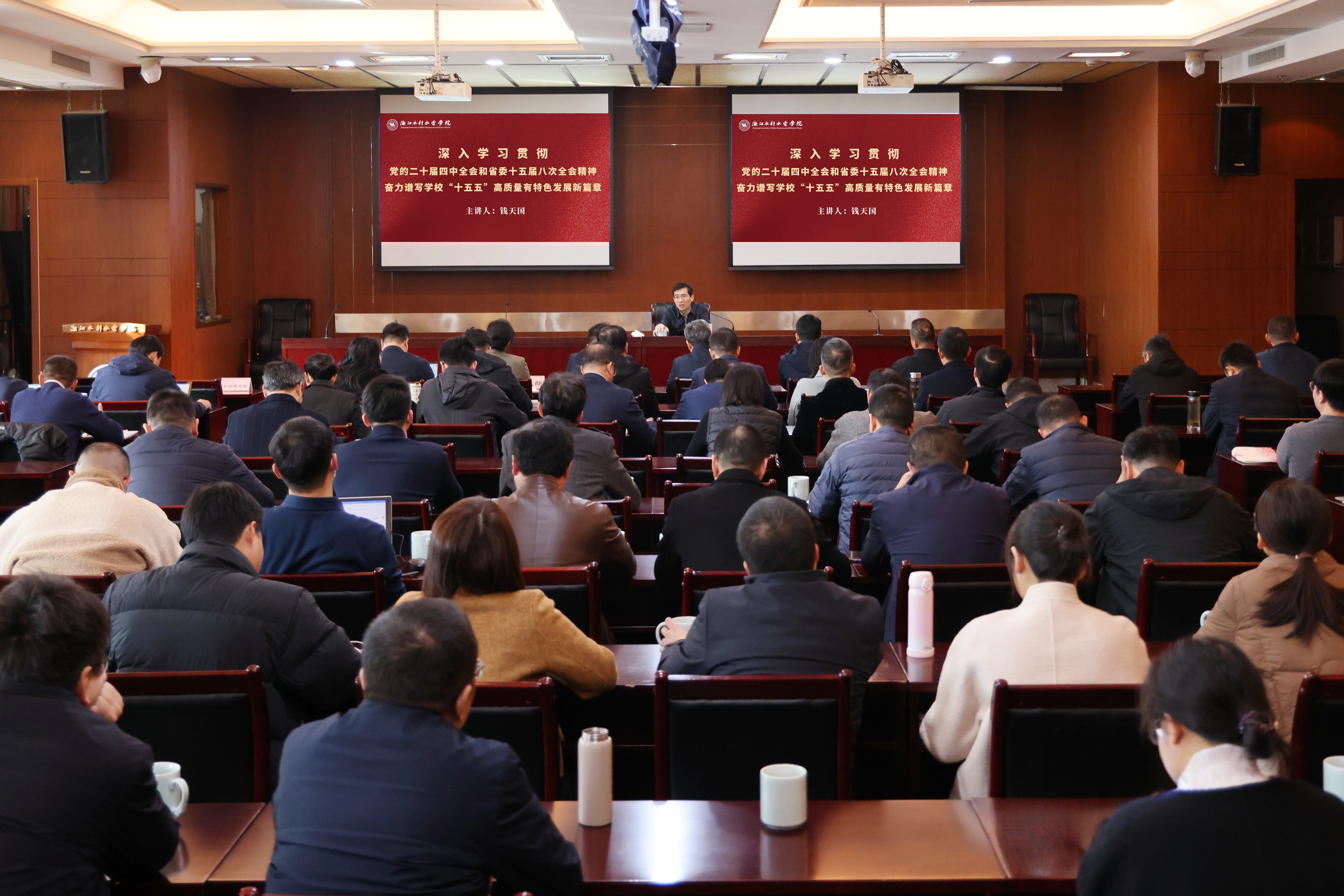 11月28日上午,学校在钱塘校区举行党的二十届四中全会精神宣讲会。校党委书记钱天国作题为《深入学习贯彻党的二十届四中全会和省委十五届八次全会精神奋力谱写学校“十五五”高质量有特色发展新篇章》的宣讲报告。全体中层干部参加学习。