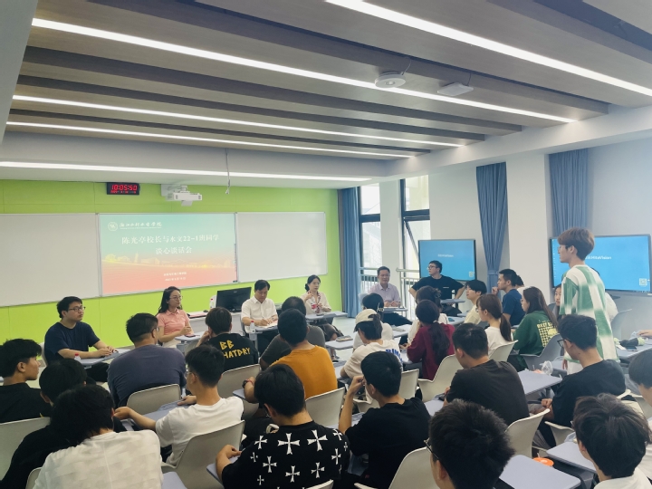 为贯彻落实党的二十大精神,推动学习贯彻习近平新时代中国特色社会主义思想主题教育走深走实,进一步建立良好的师生关系,6月16日上午,校长陈光亭在南浔校区博学楼西404教室与水利与环境工程学院水文22-1班的同学们开展了一场面对面的谈心谈话会。水环学院、办公室相关领导和部分辅导员参加了活动。