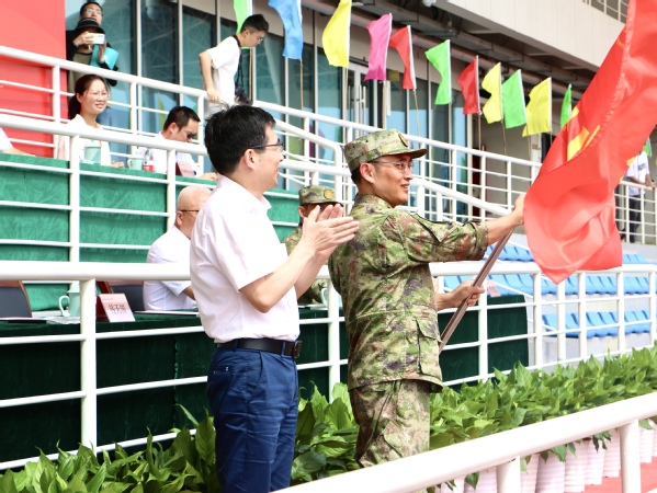 9月5日,学校2023级学生军训动员大会在庄严的国歌声中拉开序幕。校党委书记钱天国为军训师授旗,军训师师长储新松接旗。校党委副书记吴小英作动员讲话。军训师参谋长张志伟、副校长姜翰照、军训师副政委李亚慰出席大会。军训师政委、副校长李政辉主持大会。军训教官、新生辅导员、体军部参训教师、参训新生等参加动员。