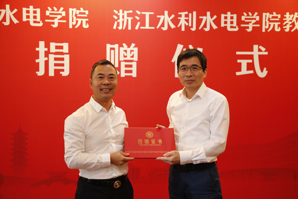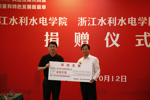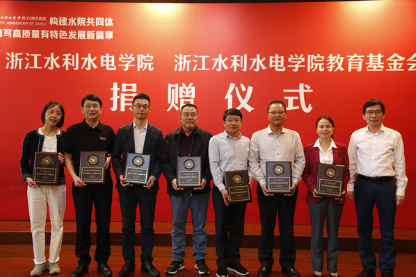 在与会领导、嘉宾、师生的共同见证下,到会的捐赠校友企业代表浙江省水电建筑安装有限公司、浙江省正邦水电建设有限公司,浙江水专工程顾问有限公司,校友代表浙江省第一水电建设集团股份有限公司副总经理陈光达校友,向陈光亭校长递送捐赠支票牌。钱天国书记为到会的校友企业和校友颁发《捐赠证书》,为地方校友分会和浙江水专顾问公司颁发“捐资助学荣誉称号”牌。学生代表为校友代表献花。