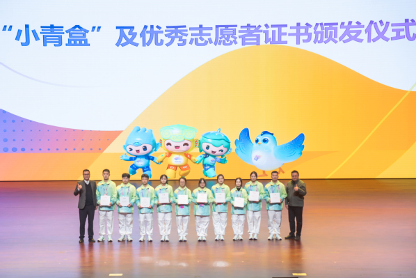 吴小英为志愿者管理团队成员颁发纪念证书。亚运赛会志愿服务领导小组成员为优秀志愿者代表颁发亚运会赛会志愿者纪念物资“小青盒”和优秀志愿者证书。