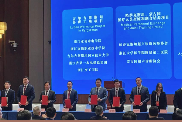 由学校牵头负责的“中国-吉尔吉斯斯坦鲁班工坊”项目入选浙江省推进“一带一路”建设成果清单,并作为20个重大合作项目之一,在会上进行现场签约。校长陈光亭、浙江交通职业技术学院校长陈凯、吉尔吉斯斯坦国立技术大学校长米兰·契米拜耶夫、浙江省第一水电建设集团股份有限公司董事长林道冶、浙江交工国际工程有限公司董事长黄夏明分别代表五家合作共建单位签署协议。副校长李政辉、吉尔吉斯斯坦国立技术大学副校长阿克尔别克·奇姆罗夫等参加会议。