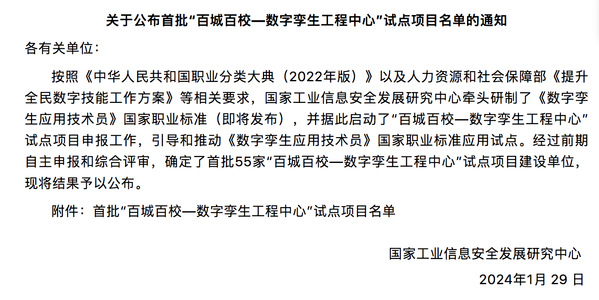 近日,由国家工业信息安全发展研究中心牵头启动的“百城百校—数字孪生工程中心”试点项目公布了首批55家建设单位,经综合评审,我校项目“数字孪生工程技术人才培养中心”成功入选。