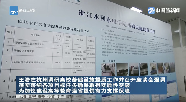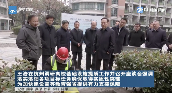 王浩先后来到浙江水利水电学院钱塘校区、中国计量大学下沙校区,深入学生宿舍、食堂、实验室和配电房,实地检查维修改造项目开工建设情况,叮嘱施工方保证质量、确保工期;要求省级有关部门积极协调配合,加强对各高校项目的指导督促。随后,王浩主持召开座谈会,听取省级有关部门、杭州市和各高校工作情况汇报,对做好下一步工作提出明确要求。