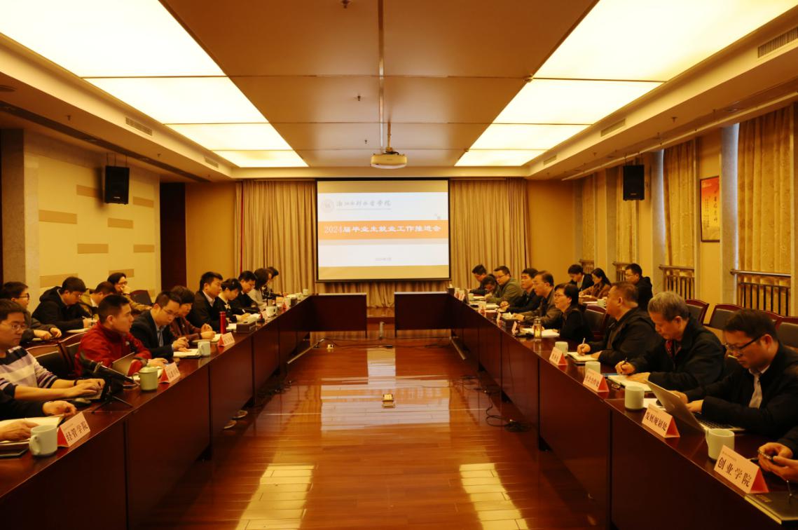 3月26日上午,我校2024届毕业生就业工作推进会在钱塘校区召开。校长万健出席会议并讲话。校党委副书记唐远彤主持会议。各二级学院院长、分管学生工作副书记、就业工作辅导员,宣传部、教务处、学生处、发展规划处、国际处、社会合作处、团委、创业学院等部门负责人参加了会议。